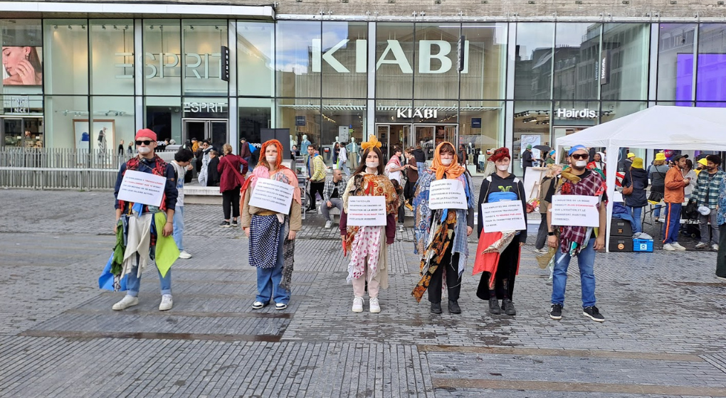 Action de sensibilisation aux enjeux de la fast-fashion place de la Monnaie à Bruxelles