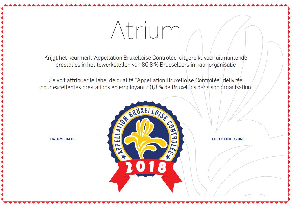 La députée bruxelloise Hannelore Goeman a remis jeudi le premier label ABC (Appellation Bruxelloise Contrôlée) à Atrium.brussels. Cette distinction récompense les administrations bruxelloise qui emploient au minimum deux tiers de Bruxellois. Le nom du label est une référence aux AOC, qui certifient les origines de produits comme le vin ou le fromage, notamment.