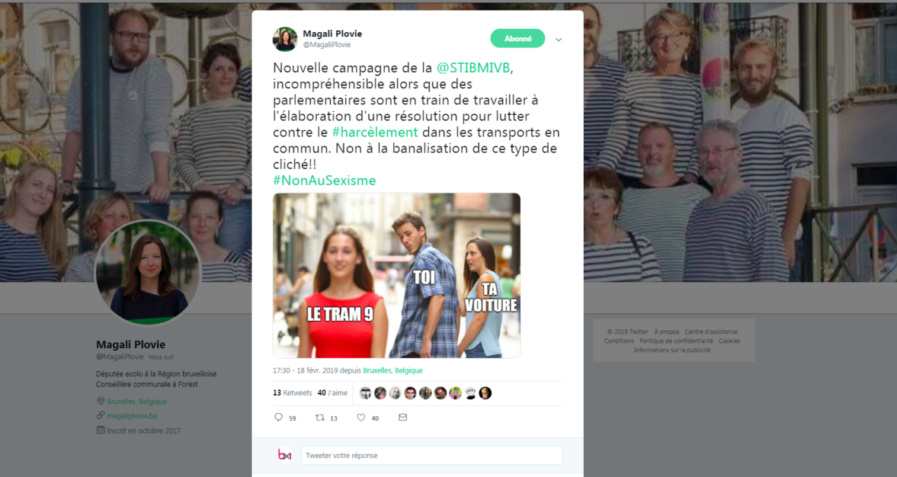 Nouvelle campagne de la @STIBMIVB, incompréhensible alors que des parlementaires sont en train de travailler à l'élaboration d'une résolution pour lutter contre le #harcèlement dans les transports en commun. Non à la banalisation de ce type de cliché!!#NonAuSexisme pic.twitter.com/ROS7sy8KPo