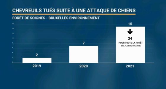 “C’est très dommageable parce que nous sommes ici dans une population relictuelle de chevreuils, que nous évaluons à 250-300 individus sur les 5.000 hectares du massif“, explique Stéphane Vanwijnsberghe, directeur de la division “Forêts & Nature” de Bruxelles Environnement. Dans de nombreux cas, soit le chien joue avec l’animal, au risque de le blesser mortellement, soit l’animal effrayé traverse un axe routier et se fait renverser.