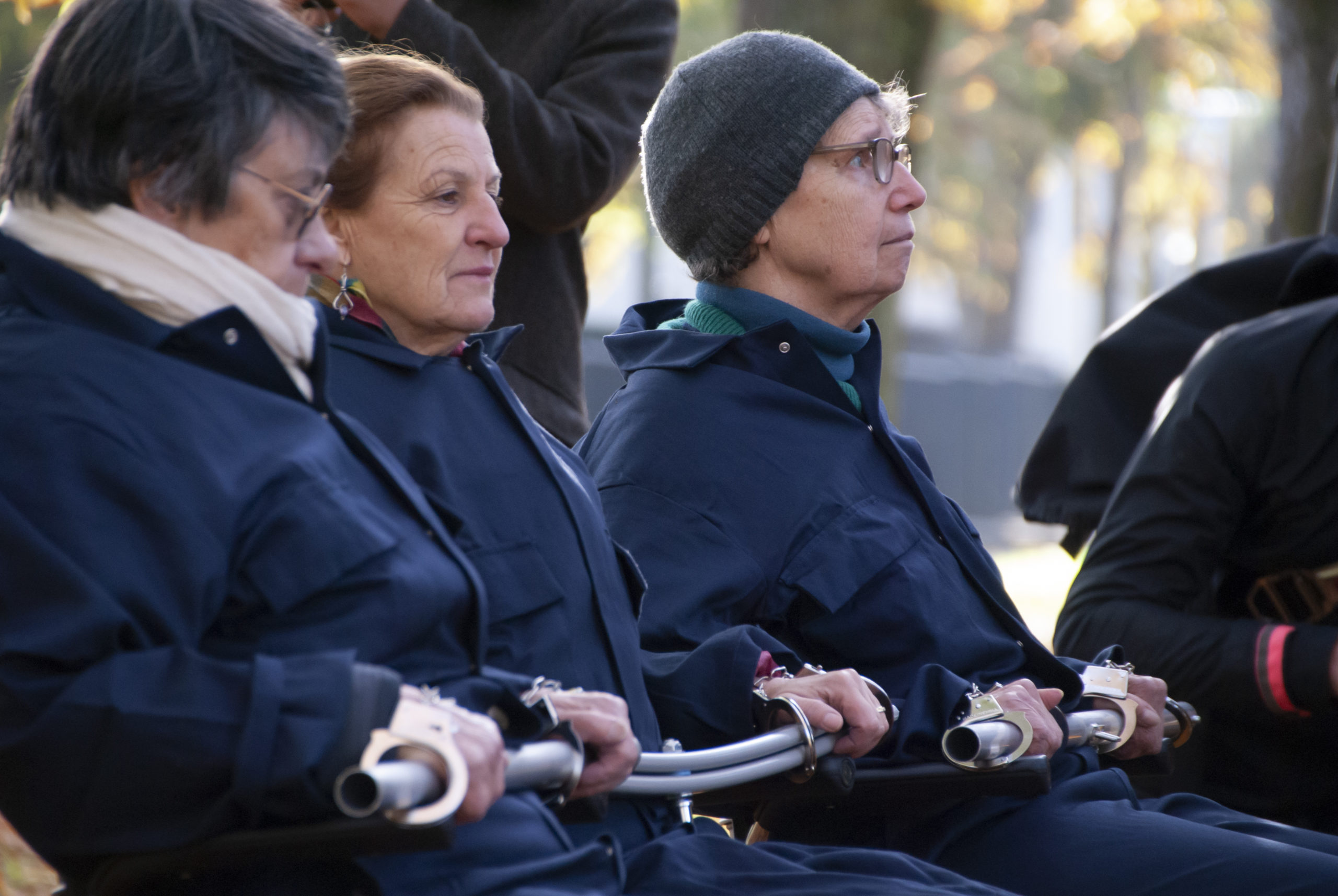 Vêtus de combinaisons bleues (en référence aux tenues des prisonniers dans les camps d’internement), trois militants ont été menottés sur une chaise et trois autres couchés dans une cage devant des reproductions de grande taille de deux dessins illustrant ces tortures et mauvais traitements.