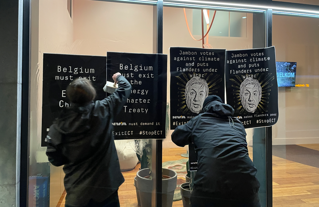 Des personnes rassemblées sous la bannière “People Against ECT” ont ciblé lundi matin le siège de la N-VA et les bureaux de la ministre des Affaires étrangères Hadja Lahbib (MR), à Bruxelles, “pour dénoncer leurs positions en faveur du Traité sur la Charte de l’Energie (TCE)“.