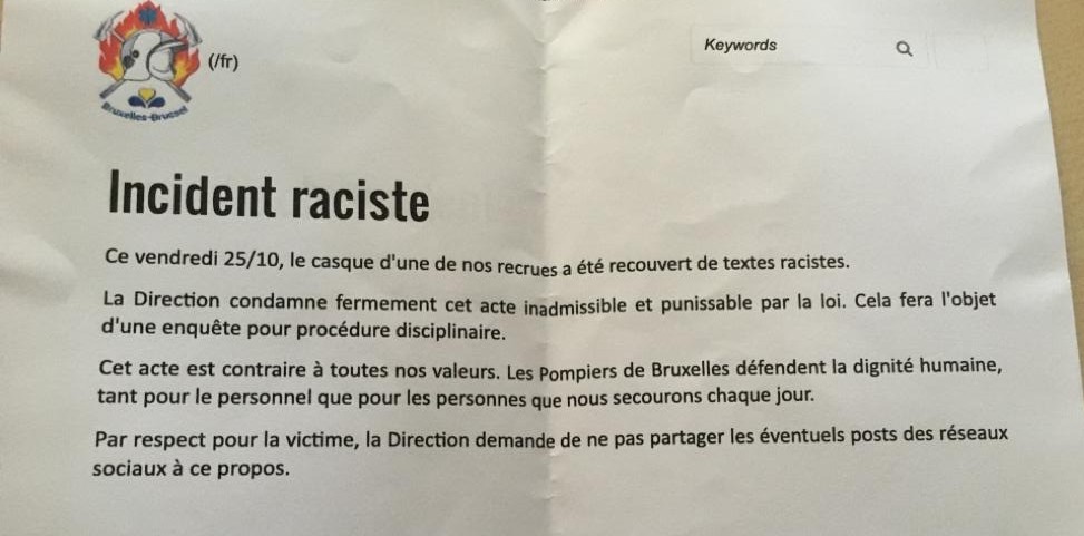 Le pompier bruxellois en formation qui a fait l’objet d’insultes à caractère raciste il y a quelques jours s’est confié, mardi soir, par l’intermédiaire de son employeur, le Service d’incendie et d’aide médicale urgente (Siamu) de Bruxelles. “C’est une situation très difficile à vivre, qui génère beaucoup de stress. Le racisme existe chez les pompiers de Bruxelles comme ailleurs, mais ces actes ne représentent pas tout le service et tous mes collègues”, a-t-il dit.
