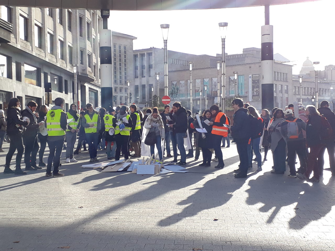À l’appel de la Fef, le RWLP, les Jeunes CSC, Comac (mouvement de jeune du PTB), la Ligue des droits de l’Homme, Ecolo J, le Mouvement des Jeunes Socialistes et la Ligue des familles sont partis à 14h00 de la gare de Bruxelles-Central. Près de 250 personnes sont présentes. Elles réclament une diminution du coût des études, une revalorisation des montants des aides sociales et un élargissement des critères d’accès aux aides sociales.