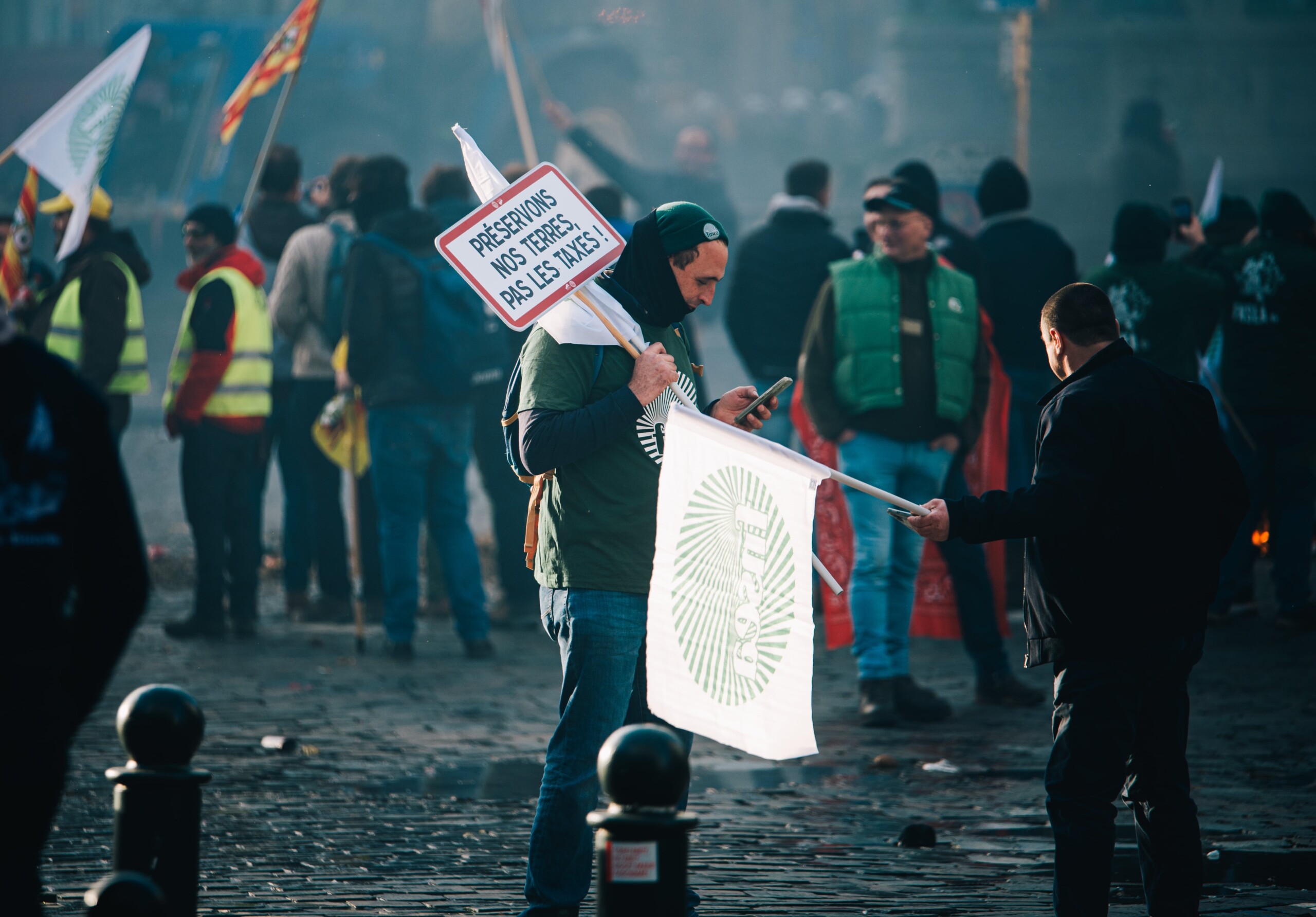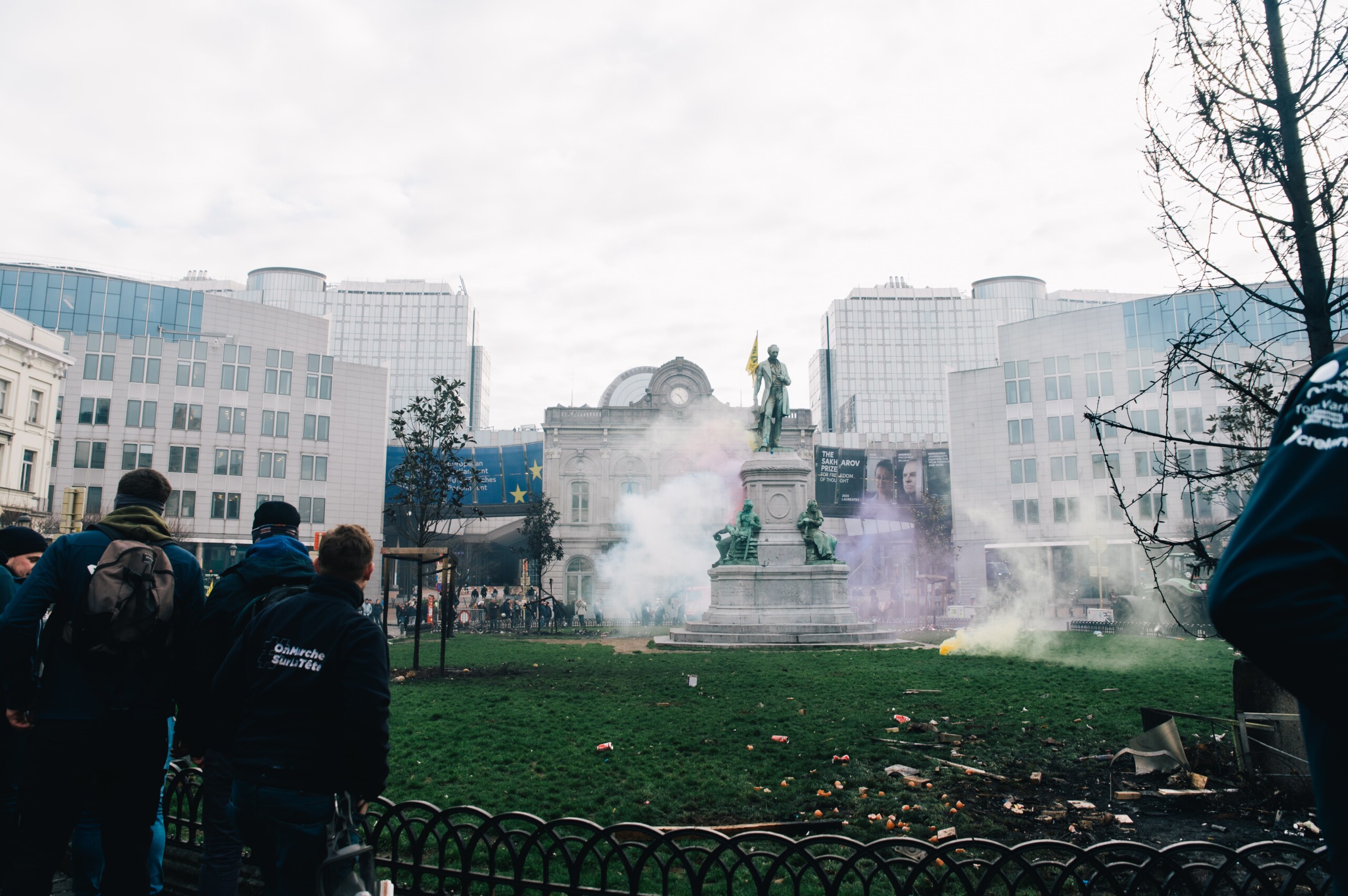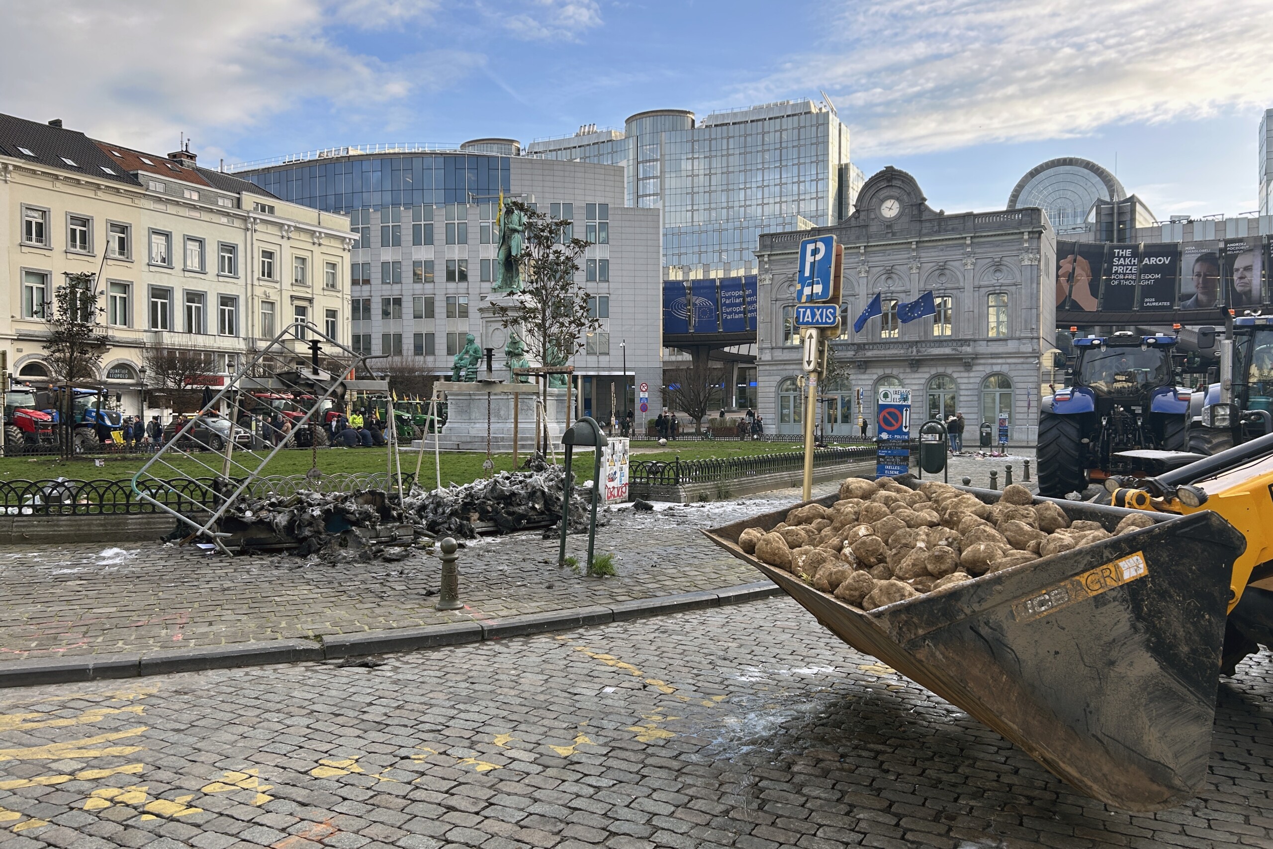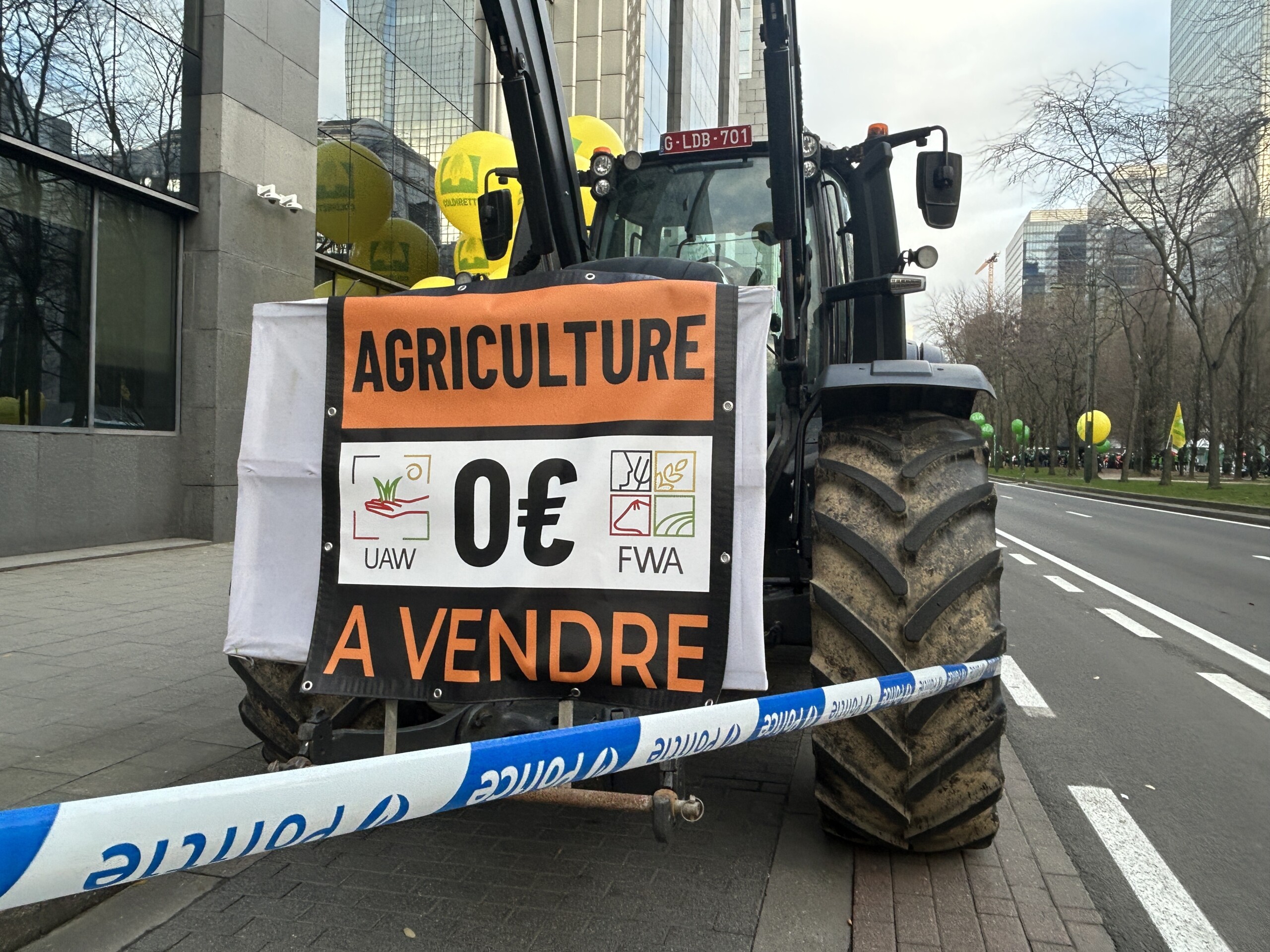 La FJA a installé une partie de son cortège et allumé un brasero. La matinée a été animée aux sons de pétards dans une ambiance bon enfant, malgré quelques dégâts constatés à l’installation électrique. De nombreux tracteurs venant du nord du pays stationnaient du côté de la rue de la Loi, jusqu’au pont du Maelbeek, où la police a installé un barrage pour empêcher tout passage vers le rond-point Schuman, coeur des institutions européennes où se tient le sommet européen. La police a dû faire usage de son canon à eau.