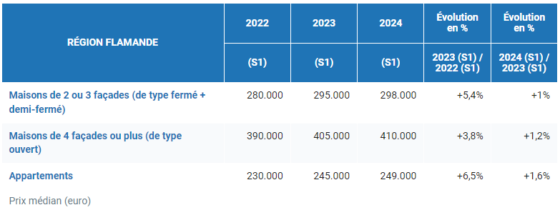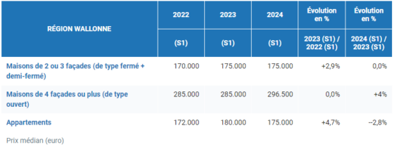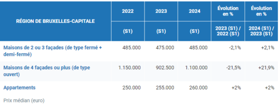 Le prix médian d’une maison fermée ou demi-fermée en Belgique atteint désormais 260.000 euros, soit une progression de 0,4% par rapport au premier semestre 2023. Les maisons quatre façades affichent une hausse plus marquée de 1,4%, avec un prix médian de 370.000 euros. Le prix médian des appartements s’établit quant à lui à 240.000 euros (+1,3%).