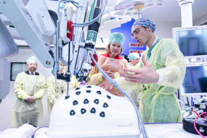 La reine Mathilde a ensuite rencontré des enfants de l’unité de dialyse. Elle s’est intéressée à leurs histoires et à leurs trajets de soins. Elle a pris le temps de discuter avec les enfants, leurs parents ainsi qu’avec le personnel soignant. La visite s’est poursuivie dans le quartier opératoire. Elle a pu découvrir le robot opératoire de l’Huderf. Celui-ci permet d’augmenter la précision du geste chirurgical. L’opération est également bien moins invasive, ce qui limite les complications post-opératoire et assure un rétablissement plus rapide.