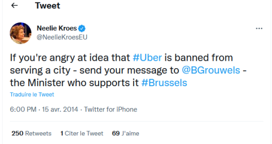 En ce qui concerne la Région bruxelloise on peut encore remonter plus loin dans le temps. Avec des interventions publiques en faveur d’Uber. Le 15 avril 2014 dans un tweet Neelie Kroes appelle ainsi les citoyens qui sont en colère avec l’idée qu’Uber n’est pas autorisé à desservir une ville, à envoyer un message à Brigitte Grouwels, qui était ministre bruxelloise des Transports à l’époque. Une commissaire européen qui appelle les internautes à faire pression sur une ministre régionale et qui la surnomme même ministre de l’antimobilité ce qui avait fait grincer des dents à l’époque. Savoir que trois mois plus tard Neelie Kroes avait un accord secret avec Uber pour devenir une employée du groupe californien jette une toute autre lumière sur ce genre de déclaration.