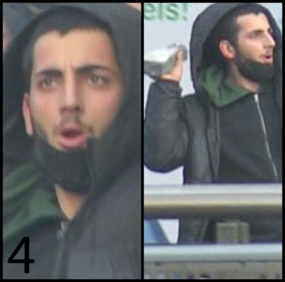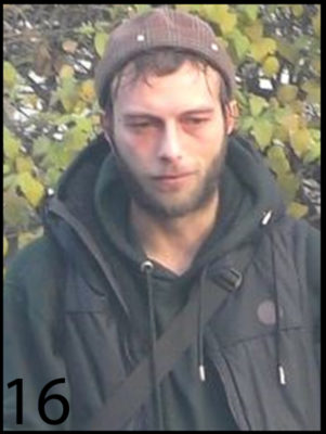 Le 16ème individu a les cheveux foncés et une barbe. Au moment des faits, il portait un sweat vert foncé à capuche, une veste noire à capuche et un bonnet brun.