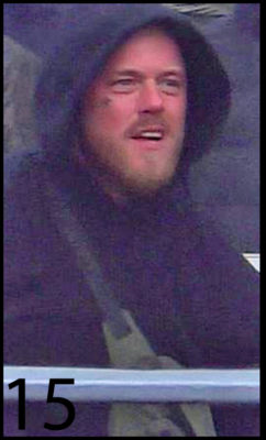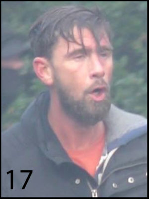 Le 17ème individu a les cheveux foncés et une barbe. Au moment des faits, il portait un T-shirt orange et une veste noire sans manches.