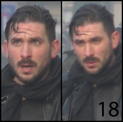 Le 18ème individu a les cheveux foncés et une barbe. Au moment des faits, il portait une veste en cuir noir et une écharpe noire.