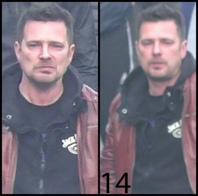 Le 14ème individu a les cheveux foncés et un bouc. Au moment des faits, il portait un sweat noir à capuche et une veste en cuir bordeaux.