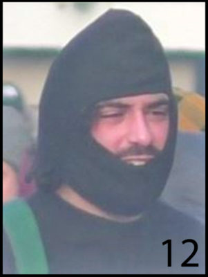 Le 12ème individu a les cheveux foncés et une barbe. Au moment des faits, il portait un pull noir, un bonnet noir et une bandoulière verte.