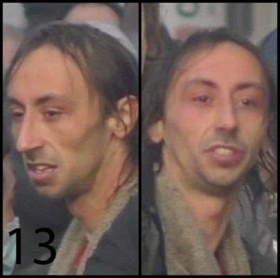 Le 13ème individu a les cheveux mi-longs et un visage émacié. Au moment des faits, il portait une veste noire et une écharpe beige.