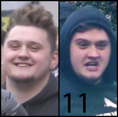 Le 11ème individu a les cheveux brun clair et une barbichette. Au moment des faits, il portait un sweat à capuche foncé avec des inscriptions blanches.