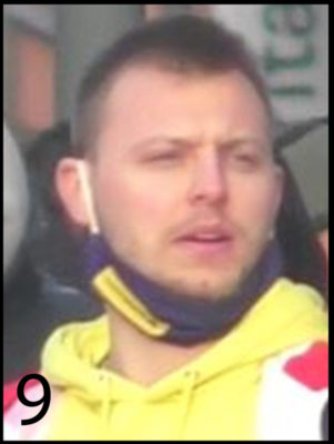Le 9ème individu a de courts cheveux foncés et une barbe naissante. Au moment des faits, il portait un sweat jaune avec des inscriptions sur le devant et une veste tricolore (rouge-bleu-blanc).