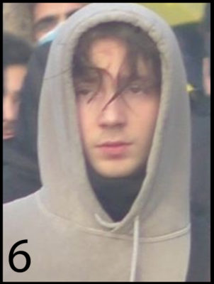 Le 6ème individu a les cheveux foncés. Au moment des faits, il portait un sweat à capuche beige avec des inscriptions blanches.
