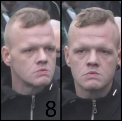 Le 8ème individu a les cheveux blonds rasés sur les côtés et un écarteur à l’oreille gauche. Au moment des faits, il portait une veste noire.