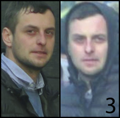 Le 3ème individu a les cheveux foncés et une barbe naissante. Au moment des faits, il portait une chemise bleu clair et une veste matelassée foncée à capuche.