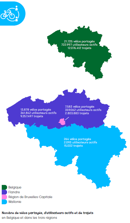 La plus grande partie (64%) des vélos partagés se trouvent en Flandre, où 76,7% des trajets ont été effectués avec ce moyen de locomotion l’année dernière. Bruxelles compte, pour sa part, 35% de l’offre, tandis que la Wallonie est à la traîne avec seulement 1%.