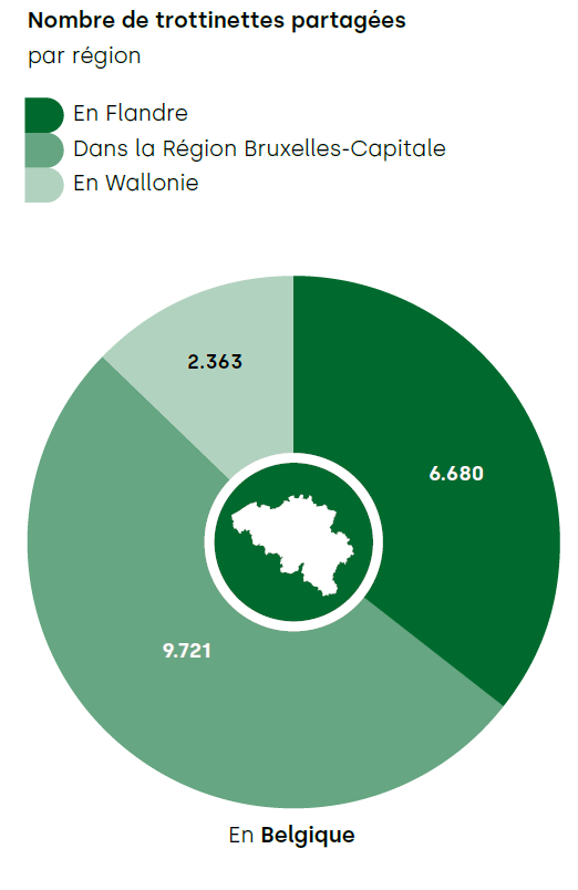 Bruxelles, où l’on trouve plus de la moitié (52%) des trottinettes partagées, constitue le centre de gravité de ce type de véhicule. La part de trajets effectués en trottinette partagée s’établit à 63,6% dans la capitale.