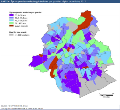 La deuxième carte s’avère également intéressante. Elle indique la répartition actuelle des médecins par tranche d’âge. Et donc peut-être aussi les pénuries de demain. Dans les zones en mauve foncée, l’âge moyen des médecins oscille entre 55,3 et 70 ans. Il est ainsi possible de conclure que la commune d’Uccle risque de faire face à une pénurie sans arrivée importante de médecins généralistes. Un des freins potentiels à l’installation dans cette commune s’avère évidemment le prix de l’immobilier.