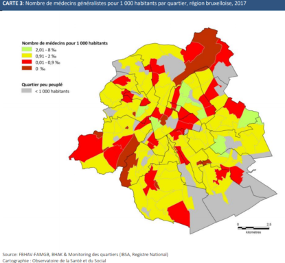 Pour donner une idée précise de l’offre de généralistes dans la capitale, l’Observatoire de la santé et du social proposait deux cartes dans son rapport de 2017. Dans la première, le nombre de médecins par 1.000 habitants est exprimé quartier par quartier à l’aide d’une couleur. Les zones vertes sont celles qui disposent aujourd’hui de suffisamment de praticiens, les zones rouges sont celles plus en tension. “Il est frappant de constater que de nombreux quartiers en rouge et bordeaux se situent à côté de zones où il y a peu d’habitants, comme le canal et les parcs ou de zones à forte densité de bureaux (centre de Bruxelles et quartier européen)”, notent les auteurs du rapport.