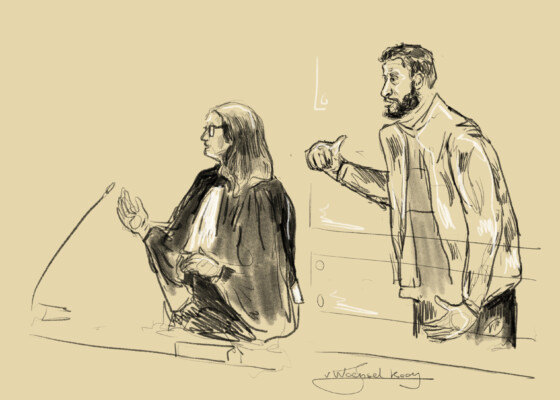 Ce dessin de Janne van Woensel Kooy montre l’accusé Salah Abdeslam et son avocate Delphine Paci lors d’une séance du procès des attentats du 22 mars 2016, à la cour d’assises de Bruxelles-Capitale, mercredi 18 janvier 2023.