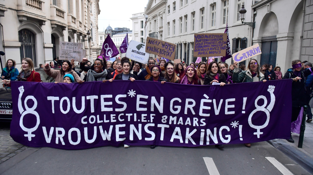“Solidarité avec les femmes du monde entier”, crient les manifestantes. Leurs pancartes affichent des slogans comme “Mon corps est à moi”, “Le féminisme n’a jamais tué” ou “Toutes unies, nous transformons la peur en force”. Cette manifestation est organisée à l’issue de la première grève des femmes en Belgique. Toute la journée, des activités de sensibilisation ont eu lieu Carrefour de l’Europe à Bruxelles et un peu partout dans le pays. À 14h00, chaque personne “s’identifiant et/ou étant identifiée comme femme” a été invitée à “faire du bruit”, où qu’elle se trouve.