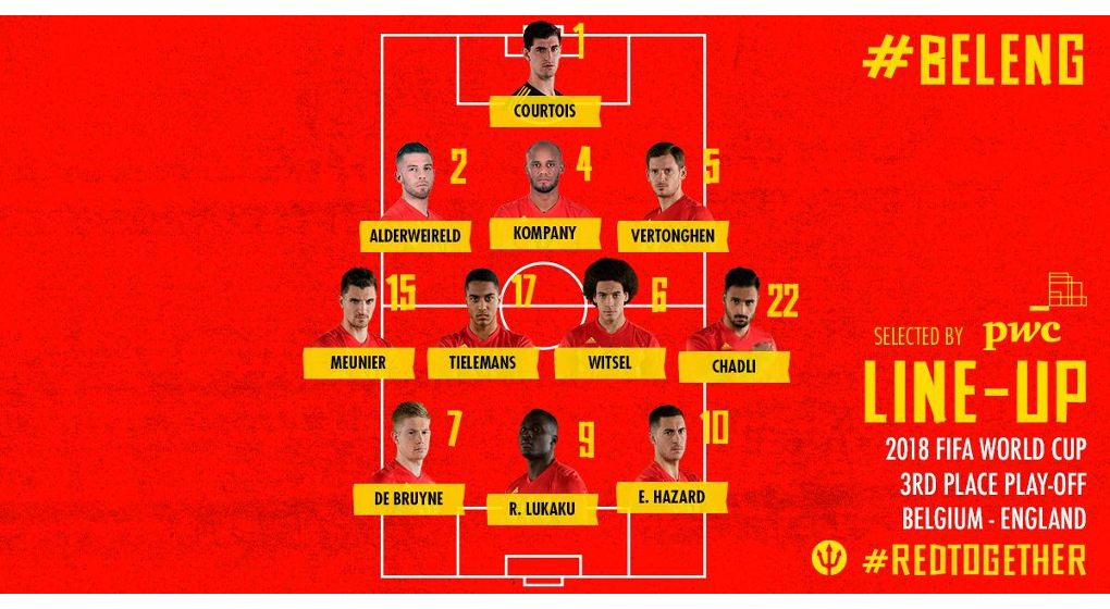 On connait désormais le onze de base pour cette petite finale de la coupe du monde face à l’Angleterre. Pas de changement au niveau de la défense avec Alderwereld, Kompanu et Vertonghen. Dans le but, la pieuvre, Thibault Courtois. C’est dans le milieu central qu’on retrouve la surprise de ce match. Youri Tielemans, l’ancien joueur du RSCA, sera donc aux côté de Witsel. Sur les flancs on retrouve Meunier à droite et Chadli à gauche. Devant, le trio De Bruyne, Hazard et Lukaku.