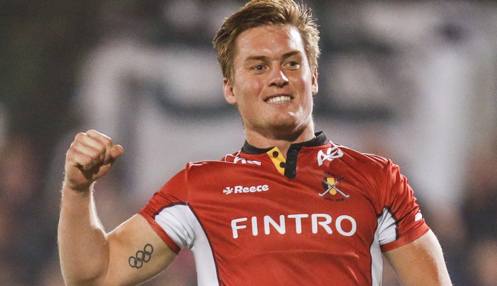 Red lions' Tom Boon celebrates after scoring during a friendly game between Belgian Red Lions and Argentina, in Uccle sport, Wednesday 26 October 2016, in Brussels. The game is a remake of Rio olympic final, won by Argentina. 9200 seats where sold for the game, a reccord for hockey in Belgium. BELGA PHOTO THIERRY ROGE