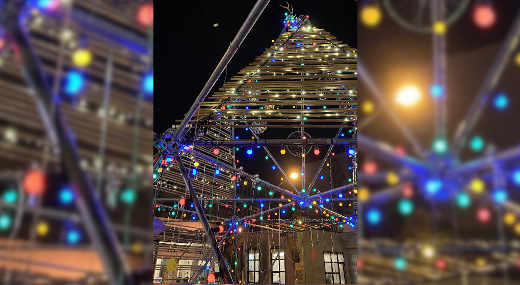 La structure qui représente un sapin de Noël atteint neuf mètres de haut. Elle est décorée avec des matériaux de « récup’» apportés par les habitants du quartier.