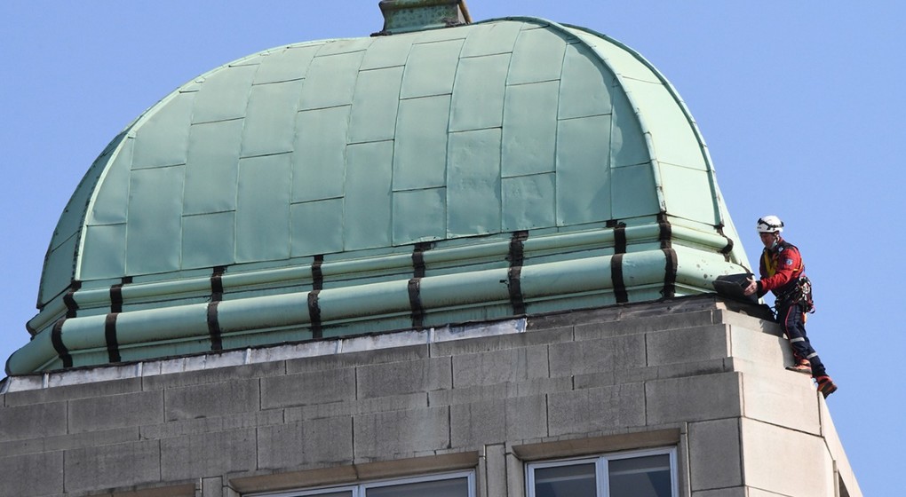 Les pompiers ont dû enlever un morceau en métal (zinc ou plomb) sur la coupole du toit, au sommet du restaurant Pizza Hut. La pièce de métal risquait de se détacher et de tomber sur les usagers de la voie publique. La coupole, difficile d’accès pour une auto-échelle, nécessitait l’intervention d’une telle équipe, rapportent les pompiers de Bruxelles. La pièce a été enlevée sans problème.