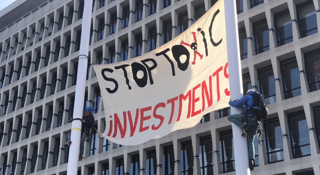 Une banderole de quatre mètres sur sept appelant à arrêter les investissements toxiques a été attachée au-dessus de l’entrée de la banque. Une cinquantaine de personnes on réalisé un die-in sur le trottoir. Des tracts ont été distribués aux employés d’ING. Cette initiative lance la contre-campagne “Greenwash-ing” du collectif, qui se décline en des affiches détournant les visuels de la campagne sur l’investissement durable lancée la semaine passée par la banque.