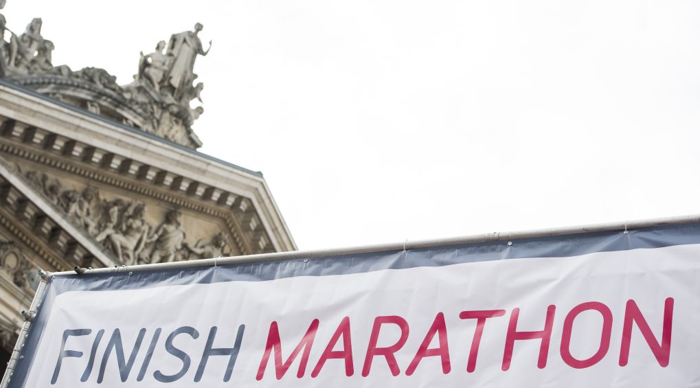 Protestation contre la privatisation de Belfius au départ du marathon de Bruxelles