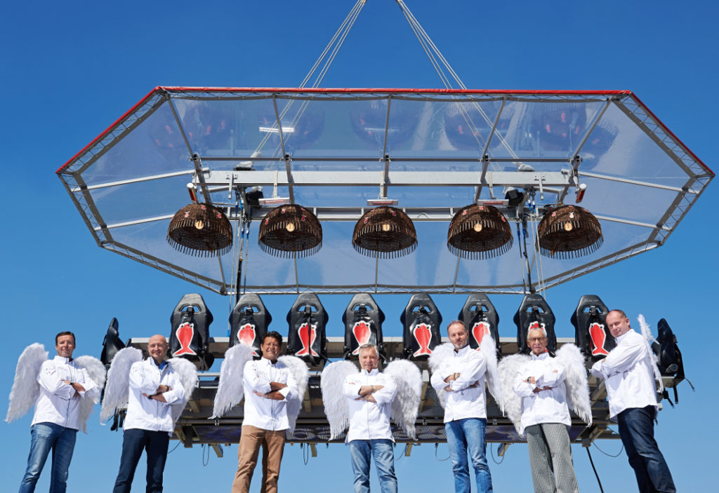 L’événement mettra en scène les chefs du Sea grill, de La Paix, du Senzanome, de la Truffe noire, de la Villa in the Sky, du Louise 345, du San Daniele, de la Villa Lorraine, du Bozar Restaurant, de la Villa Emily, d’Alain Bianchin, du De Pastorale, de l’Eau Viveet du ‘t Zilte. Les plates-formes de “Dinner in the sky” continuent à se développer et ont dernièrement été installées en Nouvelle-Zélande, en Thaïlande et aux Philippines. L’Indonésie, la Pakistan, le Panama, le Pérou et le Bahrein suivront dans les mois à venir, pour afficher un total de 65 pays bénéficiant du concept imaginé par David Ghysels.