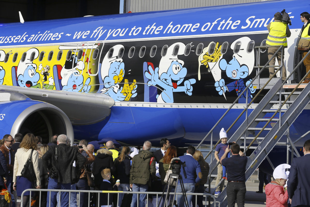 L’été dernier, Brussels Airlines avait invité le public à lui donner des idées et suggestions pour son prochain avion iconique aux couleurs de la Belgique, après Rackham (Tintin), Magritte, Trident (Diables Rouges) et Amare (Tomorrowland). Plus de 1.400 idées avaient été soumises à la compagnie aérienne belge, dont celle de l’Italienne Marta Mascellani et son projet d’un appareil habité de petites créatures bleues. C’est finalement celui-ci qui avait été retenu par un jury de personnalités. Il aura fallu sept mois de travail pour affiner le projet puis 14 jours de peinture pour que l’avion soit enfin prêt à être dévoilé samedi, en présence de Véronique Culliford, la fille de Peyo, le créateur des Schtroumpfs.