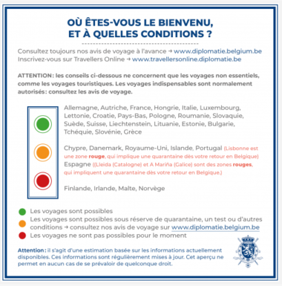 La liste sera ajustée en fonction de la situation épidémiologique de chaque pays, a indiqué Arnaud Gaspart, porte-parole des Affaires étrangères. “Le code orange signifie qu’il y a un risque de contamination plus élevé. Il n’est pas interdit de se rendre dans ces régions mais il est recommandé aux Belges qui en reviennent de se mettre en quarantaine“.