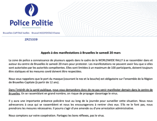 La police de la zone de Bruxelles-Ixelles lance ce samedi un appel à ne pas manifester dans et autour de la capitale. Plusieurs rassemblements ont été organisés via les réseaux sociaux dans le cadre d’un “Worldwide Rally”. Il s’agit d’un mouvement de protestation contre les mesures actuellement en vigeur pour lutter contre la propagation du coronavirus. “Les manifestations ne peuvent avoir lieu que si elles sont autorisées par les autorités compétentes. Elles sont limitées à un maximum de 100 participants, doivent toujours être statiques et les mesures covid doivent être respectées“, rappelle la polie de la capitale.