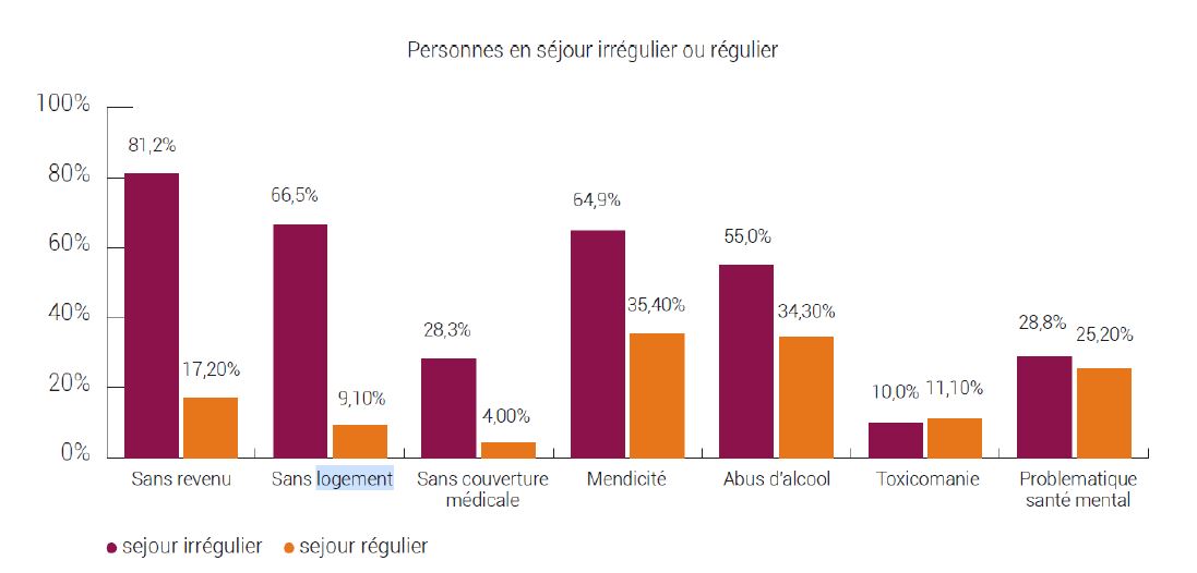 Ne pas avoir d’adresse a également une répercussion sur son statut. Sans adresse, les personnes sont souvent irrégulières sur le territoire belge. Elles n’ont pas accès au logement, ni à une aide financière ni à une couverture maladie.