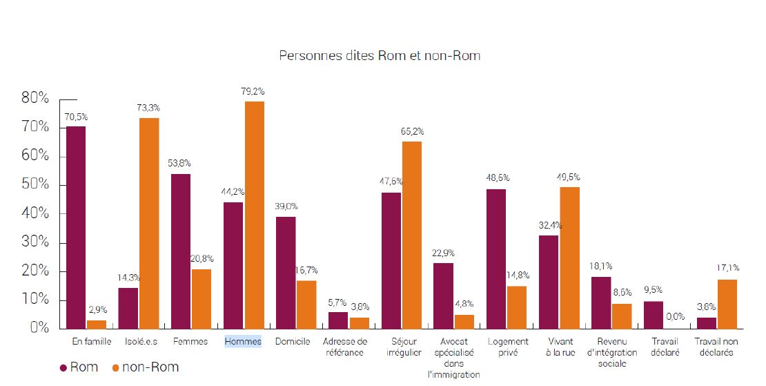 Parmi les personnes isolées, la majorité est composée d’hommes âgés entre 40 et 49 ans et ils ont une expérience dans le bâtiment. Lorsque les personnes sont en famille, il s’agit principalement de Roms. Et le fait d’être issue de cette ethnie a aussi des conséquences en termes de logement et d’emploi comme le montre ce graphique.